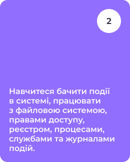 • Чому Windows популярна та її ключові компоненти з точки зору кібербезпеки • Як увімкнути моніторинг і бачити, що відбувається в системі • Файлова система, права доступу та сліди користувача • Реєстр Windows — “чорна скринька” комп’ютера • Процеси, служби та як помітити підозріле • Мережа та журнали подій (Event Viewer)