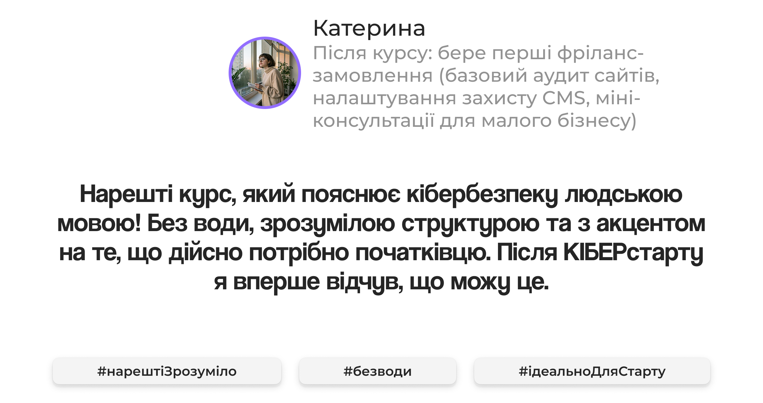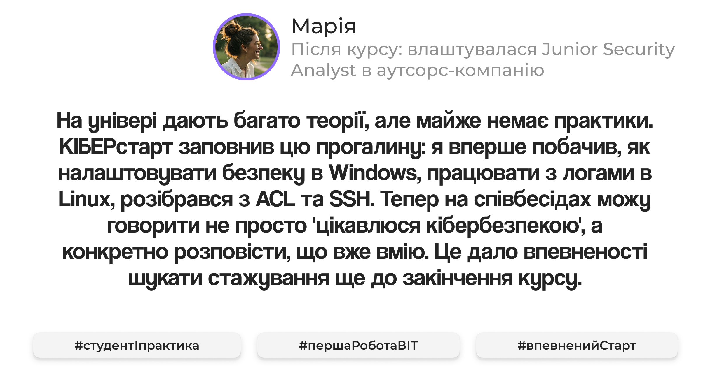 Курс дає правильну точку входу, щоб побачити сферу зсередини і прийняти усвідомлене рішення про подальший розвиток.