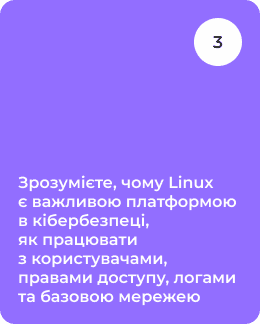 • Чому Linux люблять фахівці з безпеки • Базове безпечне налаштування Linux • Користувачі, групи та права доступу • Логи Linux та швидкий первинний аналіз • Базова мережа • Проста віртуалізація та контейнери (VirtualBox / WSL / Docker)