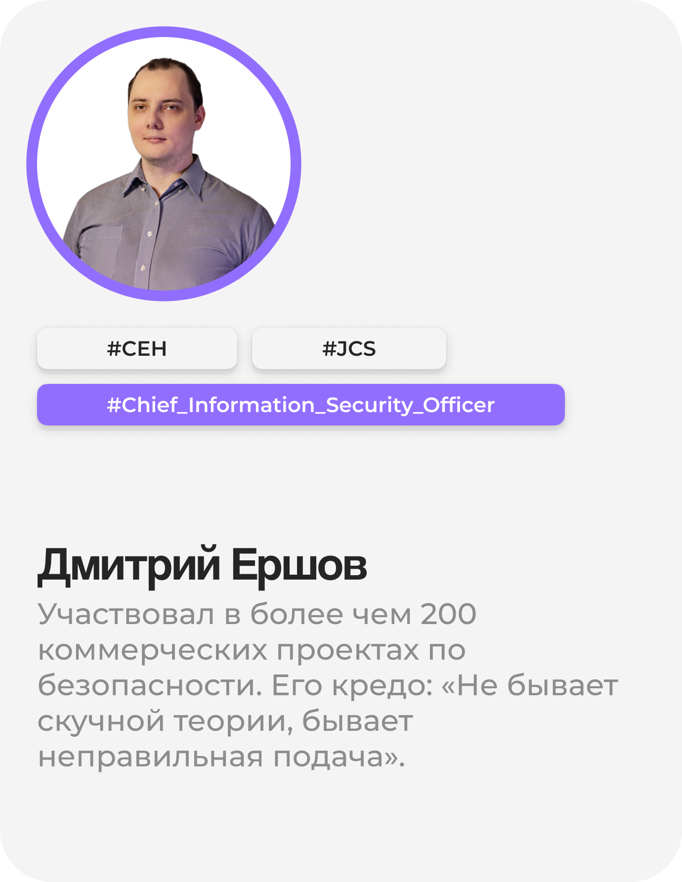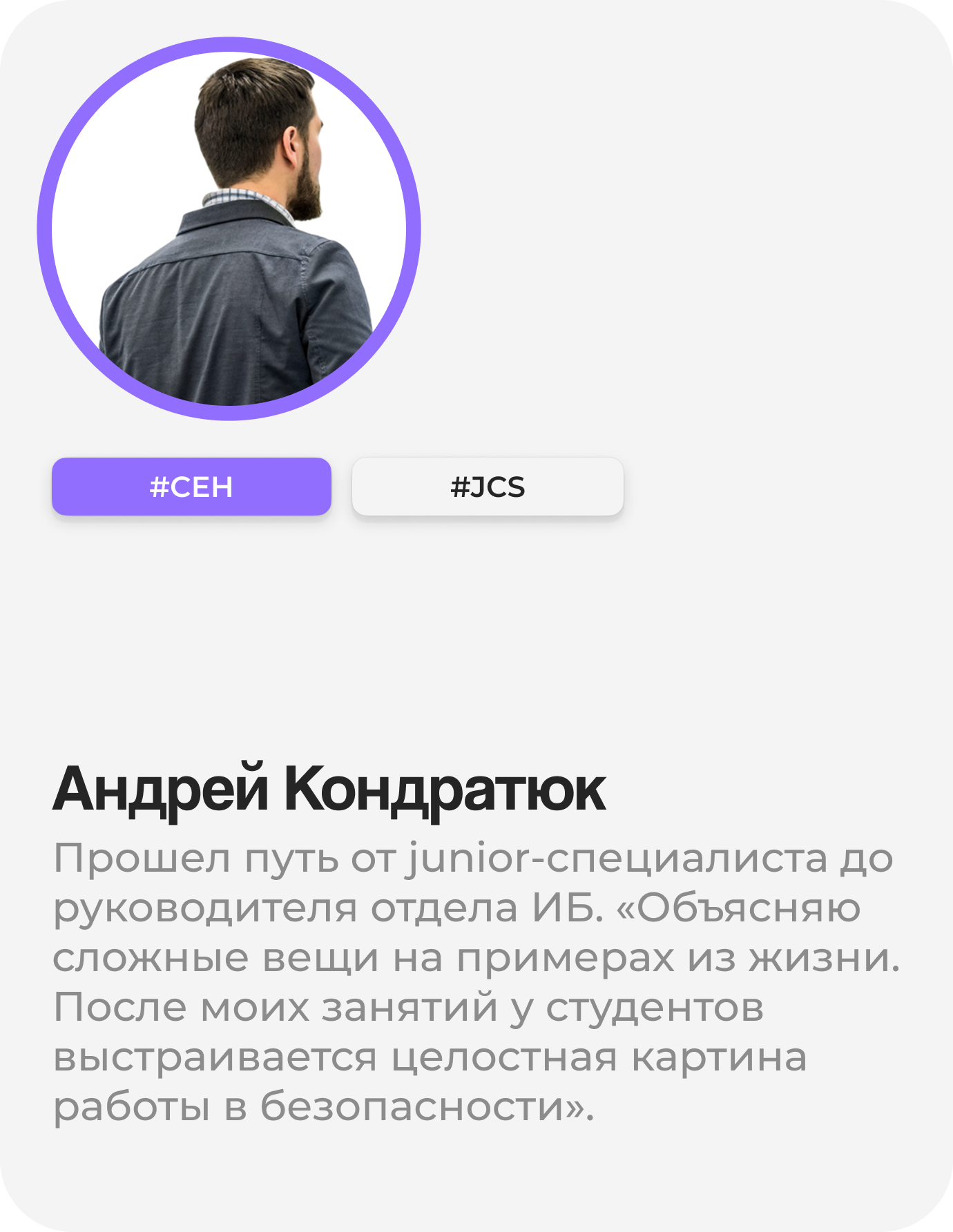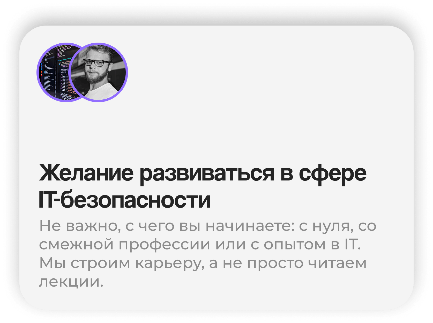 «Сменил профессию в 30 лет — ушёл из продаж в кибербезопасность. Курс дал уверенность и конкретные навыки, которые сразу пригодились. После защиты финального проекта меня пригласили на собеседование — и я прошёл! Теперь я реагирую на инциденты, а не на жалобы клиентов 😉»